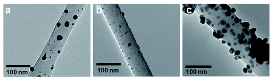 Transmission electron microscope (TEM) image of (a) Ag, (b) Au, and (c) Ni nanoparticles on cellulose nanofiber surface [74]. (Reprinted with permission from Gopiraman et al., 2018.)