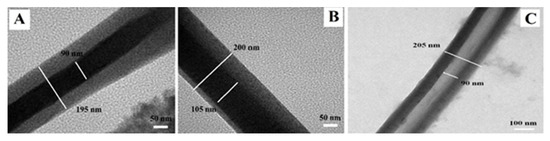 TEM has been an invaluable asset in characterizing core-shell and hollow nanoparticles and nanofibers by observing the contrast created by the electron beam diffraction, which represents the distinctive phases present in the analyzed sample. TEM images of core-shell structured polyethylene oxide (PEO)-chitosan electrospun fibers depicted in Figure 11 reveal two distinct phases [75], where the dark region represents the core while the bright region represents the shell structure. Further, TEM assists in the identification of different concentric and eccentric structures as well as in the measurement of diameters of the core and the shell components of the fiber. Additionally, the fibers once washed with water to remove the PEO core and the TEM analysis of the ensuing hollow structure can confirm the complete removal of the PEO core while the chitosan shell maintains its physical structure [75]. High-resolution transmission electron microscopy (HRTEM) is a variant of TEM with resolutions below 0.5 Å [159] which facilitates the imaging of specimens at an atomic scale and enables the analysis of the atomic structure of the samples [159]. HRTEM has been an invaluable asset in the analysis of biopolymer-assisted formation of nanoparticles including the study of their crystal planes [160,161,162], the crystal structure of cellulose [163], nanocomposites [164,165], and even in the molecular orientations of biopolymers [166].