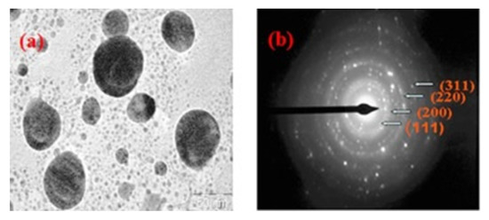 TEM micrograph of (a) guar gum capped silver nanoparticles; (b) selected area electron diffraction (SAED) pattern [192]. (Reprinted with permission from Vanamudan et al., 2016.)