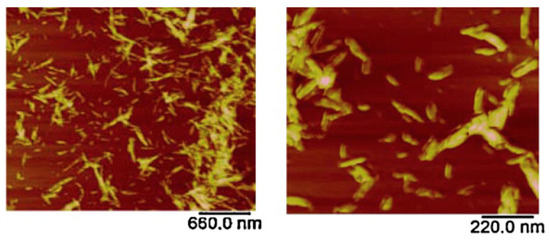 AFM has been deployed in the field of biopolymers for quite some time where it has been used in the analysis of complex structures formed by the association of biopolymers. AFM has been a powerful technique in the analysis and understanding of molecular interactions, nature, and strength of surface forces in the biopolymer systems. Previously, when AFM was first introduced in the biopolymer field, the imaging was carried out in air by depositing biopolymers on mica substrates. This technique works well for stiffer samples [206,207]; however, for soft samples, the results obtained by this technique were unreliable due to the interference of residual water present on the tip and the sample surface [208]. This residual water resulted in adhesive forces causing damage or displacement of molecules and was overcome by employing contact mode imaging in liquids [209], tapping mode [210], and non-contact imaging [211] modes. AFM has been used in the analysis of single molecule [76], conformations [78], local structure and elasticity of gels [212], gelation mechanisms [213], and nanoparticle topography [79,80]. Quantitative information including the contour length and the molecular heights has been measured accurately using high-resolution AFM images. Studies on the single chitosan strands deposited on mica surface revealed the contour lengths of chitosan strands around 94–178 nm with an average molecular height of 0.45 ± 0.04 nm [214]. Similar studies have been conducted to determine the size of a single cellulose nanocrystal; AFM has provided an efficient way to evaluate the length, width, and aspect ratios of these individual crystals (Figure 13) [81].