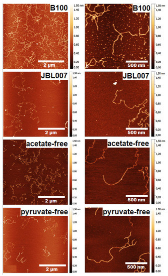 The AFM images depicted in Figure 14 revealed different structural features for different strains. Xanthan from the wild-type strain Xanthomonas campestris B100 showed branching and overlapping sections while the one from the strain JBL007 showed no branching. The acetate-free xanthan shows no branching with single and double-stranded areas and the pyruvate-free xanthan show a homogenous and branched structure with single and double strands (Figure 14).