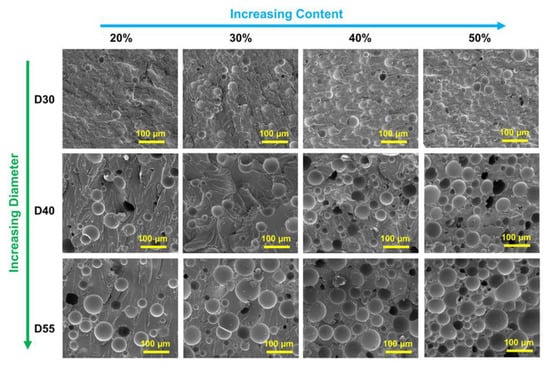 Scanning electron microscopy (SEM) graphs of lightweight composites with different hollow glass microsphere (HGM) diameters and contents.