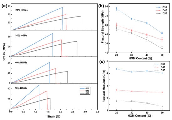 The stress–strain curves of HGM/EP LWTI composites with different diameters and HGM content in a three-point bending test are shown in Figure 2a. The composite’s flexural strength and the slope of the stress–strain curves decreased with the increasing HGM diameter in the four HGM content groups. The HGMs’ strength and modulus values are related to their diameter, which further influenced the reduction of flexural strength and flexural modulus of these lightweight composites. The relationship between HGM diameter and the composites’ flexural strength and flexural modulus is presented in Figure 2b,c.