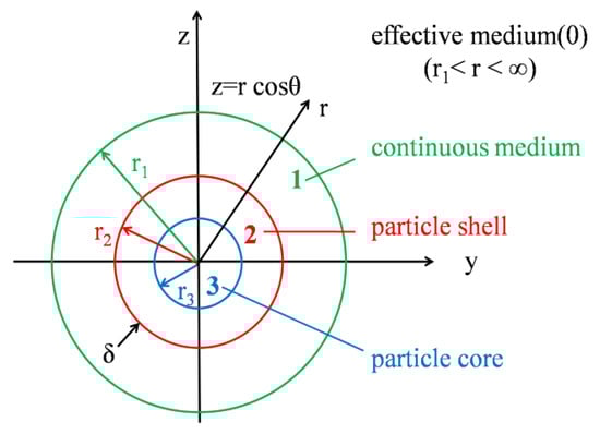 In this paper, HGM/EP LWTI composites were formed from spherical units composed of epoxy resin uniformly surrounding HGMs. The thermal insulation performance of macro composites is consistent with that of the spherical basic units. Therefore, an analysis of the thermal insulation performance of HGM/EP LWTI composites can be simplified as a spherical unit, as shown in Figure 3.