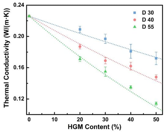 Figure 4 also illustrates that the thermal conductivity of HGM/EP LWTI composites decreases with the increasing HGM content of the composites, when the same HGMs are used. The air has a blocking effect on heat transfer because the gas is surrounded by the spherical HGM shell and dispersed uniformly in the EP. As the HGM content increases, the volume of the gas increases, and the heat transfer blocking effect will become more prominent; thus, the thermal conductivity of the composite will decrease, which is consistent with other references [20,29].