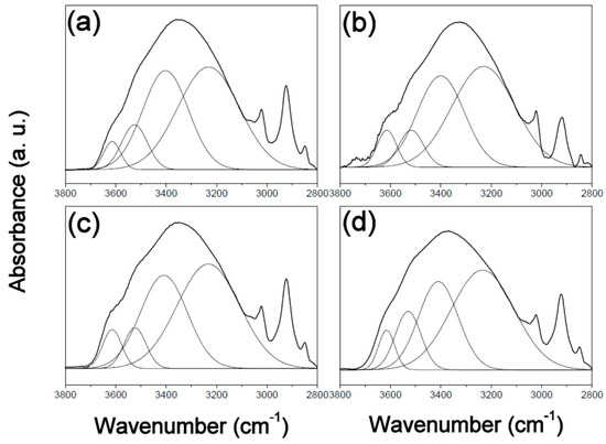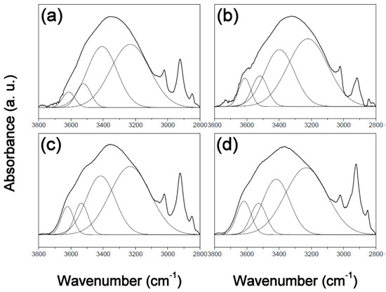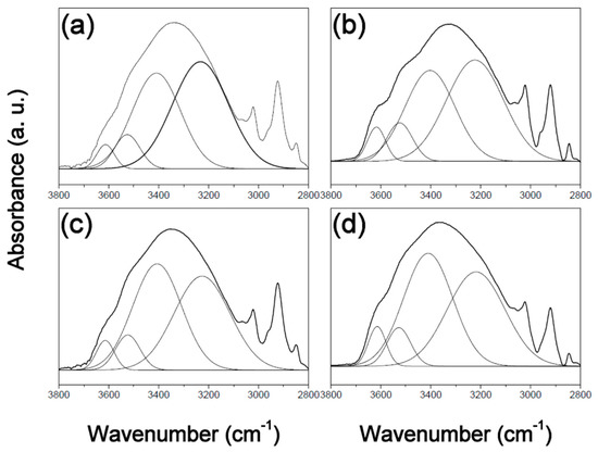 In order to understand the mechanism responsible for the observed changes in surface free energy, the PVPh polymer films in this study were characterized by FT-IR spectroscopy. Figure 1, Figure 2 and Figure 3 display expanded FTIR spectra in the 3800–2800 cm−1 region for the three films, before and after thermal treatment at 180 °C for different times. The spectrum of the PVPh polymer exhibits a hydroxyl absorbance band that can be fitted by four Gaussian functions, namely a narrow shoulder absorbance band at 3650–3580 cm−1 that corresponds to free hydroxyl groups, an absorbance peak at 3550–3515 cm−1 that corresponds to weak hydroxyl-π hydrogen bonding, an absorbance peak at 3450–3350 cm−1 that corresponds to hydrogen-bonded hydroxyl groups in linear chains of intramolecular hydrogen bonding, and one at 3234–3110 cm−1 due to hydroxyl groups involved in hydrogen-bonded “dimers” (OH–OH) and multiple hydrogen-bonding interactions in cyclic structures (intermolecular hydrogen bonding) [20,21].