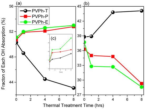 All curing results are summarized in Tables S1–S3 and Figure 4 by using Gaussian function by controlling the wavenumber and half-width within ± 10 cm−1. In our previous report, we revealed that the free energies of polymer surfaces can be altered by changing the degree of intra- or intermolecular hydrogen bonding [10,11,12,13,14,15,16]. A decrease in intermolecular hydrogen bonding leads to a decrease in the surface free energy of a polymer; conversely, the surface free energy of a polymer increases with increasing intermolecular hydrogen bonding. As mentioned above, heat treatment at high temperatures generally disrupts hydrogen bonding, and differently distributed hydrogen bonds (intra- and intermolecular hydrogen bonded) are formed after rapid cooling to ambient temperature. Firstly, we observed that the area fraction of free hydroxyl was increased with the increase of thermal treatment time as expected in Figure 4c. Secondly, it is clear that the fraction of intermolecular hydrogen bonds in PVPh-T decreased from 50.3% to 43.1% as the thermal treatment time was increased from 0 to 8 h (Figure 4a); this decrease resulted in the thermally treated PVPh-T exhibiting a lower surface free energy. On the contrary, the fraction of intermolecular hydrogen bonds in PVPh-P increased from 50.7% to 52.8% with increasing thermal treatment time (0–8 h; Figure 4a); this increase resulted in the thermally treated PVPh-P having a higher surface free energy. The hydrogen-bonding distribution in PVPh-E followed a similar trend to that observed for PVPh-P; intermolecular hydrogen bonding increased from 51.1% to 53.0% as the thermal treatment time increased from 0 to 8 h (Figure 4a). Furthermore, Figure 4b shows the area fraction of intramolecular hydrogen bonding of PVPh-T, PVPh-P, and PVPh-E, and it shows the completely different trend with the area intermolecular hydrogen bonding. We found that the fraction of intramolecular hydrogen bonding in PVPh-T increased from 38.8% to 44.1%, whereas PVPh-P and PVPh-E both decreased from 36.3% to 29.3% and 37.7% to 28.6%, respectively.