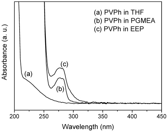 UV-visible absorption spectra of PVPh in various organic solvents: (a) tetrahydrofuran (THF), (b) propylene glycol methyl ether acetate (PGMEA), and (c) ethyl-3-ethoxypropionate (EEP).