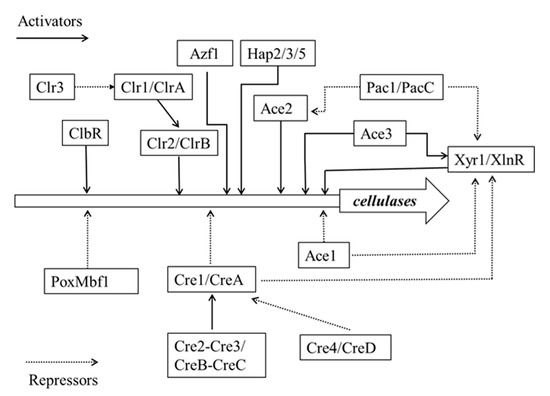 Schematic diagram of a transcriptional regulatory network of genes encoding cellulolytic enzymes in fungi. The solid line with arrowhead represents activated gene expression. The dotted line with arrowhead represents suppressed gene expression.