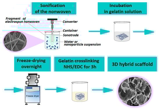 Various scaffold formation methods have been developed for tissue regeneration applications. It is crucial to be aware of their advantages and limitations as well as the influence of processing conditions on the (sub)molecular structure and properties of materials. Polymeric scaffolds may be formed using electrospinning [1,2], 3D printing [3,4,5], thermally induced phase separation (TIPS) [6], foaming [7] or leaching techniques [8,9], etc. However, all of these methods have disadvantages described in detail by others [10,11]. For example, the morphology of electrospun fibers mimics collagen fibers present in the extracellular matrix of the tissues. However, tight pores of electrospun nonwoven fibers do not enable effective scaffold penetration by the cells. A variety of approaches have been investigated to enhance the pore size of the electrospun nonwovens [12]. Alternatively, 3D printed scaffolds indicate a precisely designed pore size and architecture, although 3D printer resolution is limited and total porosity is less than 80% [13,14]. Moreover, the size of the filaments is large, compared to the cell dimensions [15]. Another form of currently investigated materials are hydrogels. For soft tissue regeneration, this form of material is beneficial due to its hydration. However, poor mechanical properties limit their use for load bearing applications. These reasons have contributed to the development of hybrid scaffolds. A hybrid scaffold combines the advantages of selected techniques such as electrospun fibers and hydrogels.