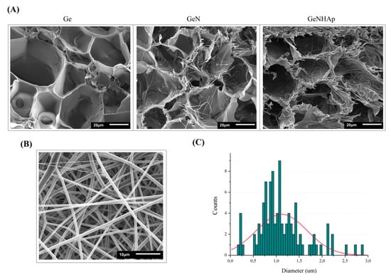 Morphology evaluation. (A) SEM images of the samples: Ge, GeN, GeNHAp; (B) SEM image of the PLGA fibers; (C) distribution of the fibers’ diameter.