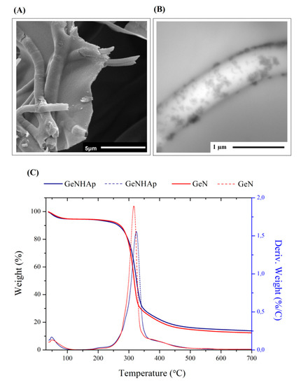 Analysis of fibers covered with HAp (GeNHAp). (A) SEM image presenting PLGA fibers embedded in the walls of freeze-dried Ge; (B) TEM image of a single fiber covered with HAp and embedded in freeze-dried gelatin solution; (C) thermogravimetric curves of the GeN and GeNHap samples. The data show the differences in the thermal behavior of each type of sample and determine the HAp amount in the GeNHAp sample.