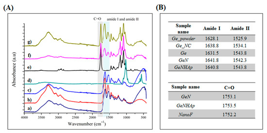 FTIR analysis. (A) Spectra of Ge_powder; (b) Ge_NC; (c) Ge; (d) HAp_powder; (e) NanoF; (f) GeN; (g) GeNHAp. (B) Tables-presenting wavenumbers in which spectra for selected chemical bonds occur.