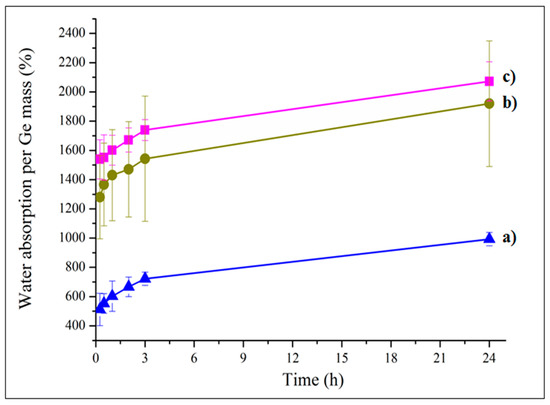 Water absorption of analyzed 3D hybrid scaffolds (b) GeNHAp and (c) GeN in comparison to the freeze-dried gelatin sample (a) Ge.