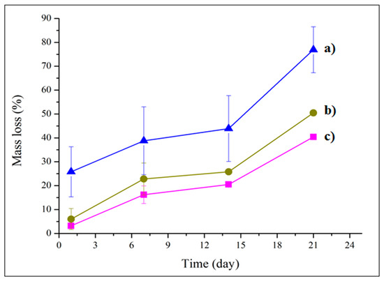 Mass loss of prepared 3D hybrid scaffolds (c) GeN and (b) GeNHAp in comparison to freeze-dried gelatin sample (a) Ge.