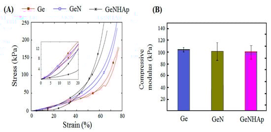 Stress–strain relationship of the 3D hybrid scaffolds (GeN, GeNHAp) determined with DMA: (A) compression stress–strain response of the analyzed 3D scaffolds; (B) compressive moduli of analyzed scaffolds.