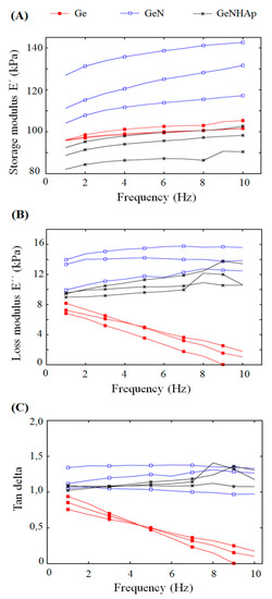 Viscoelastic properties of the 3D hybrid scaffolds (GeN, GeNHAp) and Ge freeze-dried samples determined with DMA. (A) Storage modulus as a function of frequency; (B) loss modulus as a function of frequency; (C) tangent of phase lag as a function of frequency.