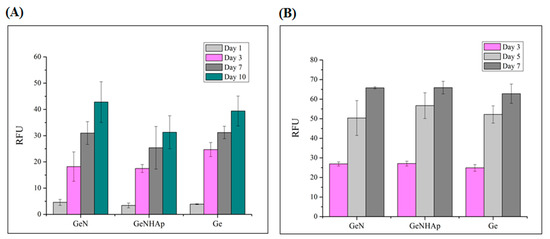 Figure 9 illustrates the cellular viability obtained for mouse fibroblasts (L929) and human osteoblasts (MG63) cultured on 3D scaffolds (Ge, GeN, GeNHAp) analyzed up to 10 days of the experiment (Figure 10). Cellular morphology was illustrated using FM and SEM microscopy and is presented in Figure 11 and Figure 12. All cells were spread on the scaffold surface and migrated inside the scaffold. Cellular lamelliopodium with filopodia were entwined on the scaffold walls. A Presto Blue assay was performed on the samples in contact mode, confirming the nontoxic character of the samples (Figure 10).