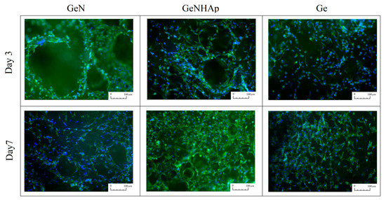Fluorescent microscope images presenting fibroblasts spreading on the 3D scaffolds (Ge, GeN, and GeNHAp). Observations were performed after three and seven days of cell culture. The actine skeleton was stained green, while the nucleuses were stained blue.