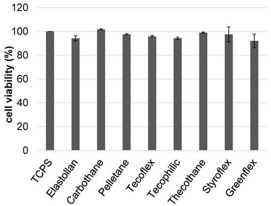 Biocompatibility of the tested polymer samples. Urothelial cells are not impaired by any of the polymers tested (100% reference = tissue culture polystyrene (TCPS), HUC-1 cells, mean ± SD, ANOVA post hoc Bonferroni n.s. at p < 0.05).