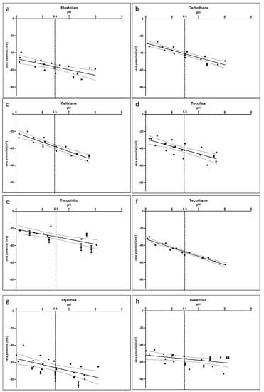 The slope of the curves in Figure 3 reveals slightly more negative values at higher pH, as would occur in an infection situation. Even though the absolute values differed between the investigated polymers, the slope of the curves seemed similar for all materials.