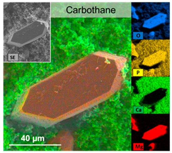 EDX analyses of encrustations on Carbothane. Mapping of the elements shows large crystals of Mg, P, and O, presumably being struvite (appearing orange). The Ca- and P-containing matrix of calcium carbonate apatite (appearing green) was multi-layered and rough in nature. FE-SEM Merlin VP compact (Zeiss) with EDX-detector XFlash 6/30 (Bruker).