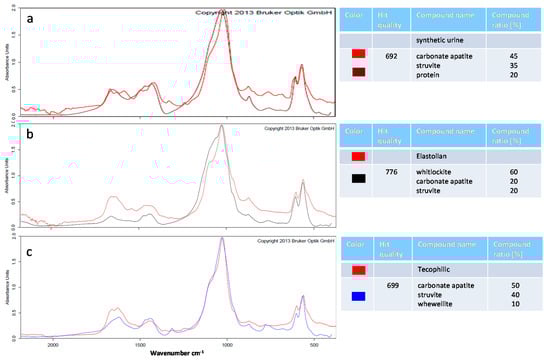 FTIR analysis of encrustations formed in the in vitro-encrustation system. Measured absorption spectra (red) of mineral deposits of the synthetic urine without polymer (a) or the precipitations on the polymer samples (Elastollan: b, Tecophilic: c). Absorption spectra of the OPUS™ reference library with the best match are shown in purple, black, and blue, respectively. The amount of calcium phosphate (carbonate apatite and whitlockite) precipitates is higher on Elastollan. In contrast, on Tecophilic, the amount of magnesium phosphates (struvite) is elevated compared to complete urine precipitates. (ALPHA FTIR spectrometer, OPUSTM library, Bruker).
