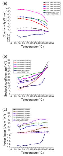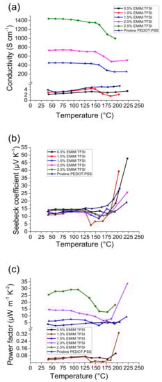 Figure 1b shows that EMIM:TFSI treatment did not significantly change the Seebeck coefficient of the composite films. Figure 1c shows that the resultant power factors for the 1.5, 2.0 and 2.5% EMIM:TFSI films are significantly higher than PEDOT:PSS across the temperature range studied. The PF for the Pristine PEDOT:PSS at 40 °C is 0.04 µW·m−1·K−2 and peaks at 0.1 µW·m−1·K−2 at 177 °C. 2.5% EMIM:TFSI at 40 °C, however, has a PF of 28 µW·m−1·K−2. This is comparable to optimized post DMSO and ethylene glycol treatments [5]. The PF reaches an optimum at 109 °C of 29 µW·m−1·K−2. The 1.5 and 2.0% films show a PF of 6 µW·m−1·K−2 and 14 µW·m−1·K−2, respectively at 40 °C, whilst the 0.5 and 1% EMIM:TFSI films exhibit a similar PF to Pristine PEDOT:PSS due to their equally low electrical conductivity with negligible increases in Seebeck coefficients.