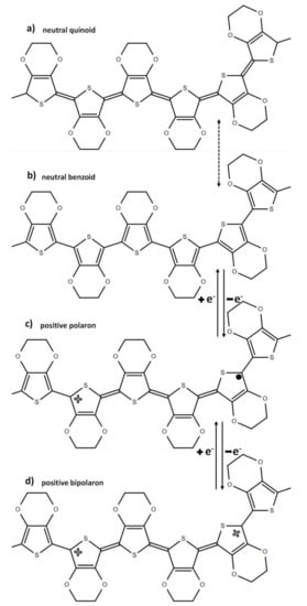 The resonance forms of Poly(3,4-ethylenedioxythiophene) (PEDOT) thiophene back bone, (a) denotes the quinoid form, meanwhile (b) is the benzoid form. (c) and (d) represent the positive polaron and bipolaron phase, respectively.