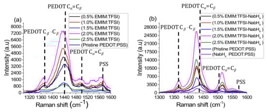 Despite the significant red shift (indicating improved carrier mobility) in NaBH4 films, the conductivity for these films are lower than EMIM:TFSI films due to reduced charge carriers. Pristine PEDOT:PSS is included in Figure 4 as a baseline. The peaks at 1365 cm−1 and 1500 cm−1 correspond to the Cβ-Cβ inter ring stretching vibration and the asymmetrical Cα=Cβ vibrations, respectively [30,31]. PSS bond stretching and bending vibrations can be seen at 1580 cm−1.