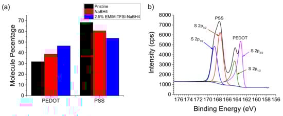 Quantified molecular percentage ratio between PEDOT and poly(4-styrenesulfonate) (PSS) (a), and 2.5% EMIM:TFSI-NaBH4 XPS spectra outlining deconvoluted sulphur peaks representing PEDOT and PSS (b).
