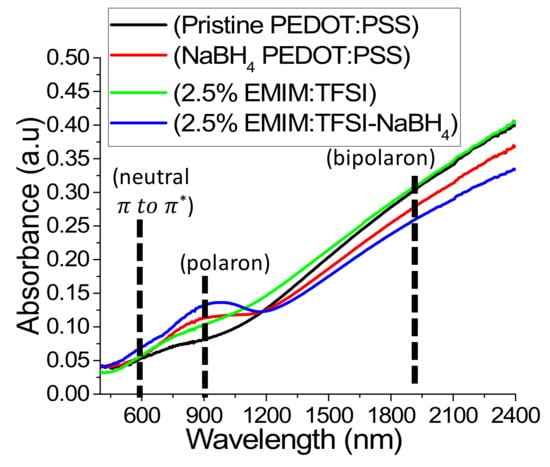 The redox reaction can result in the change of the resonance form of the PEDOT which can be evidenced by a change in the UV-Vis-NIR absorption spectrum. Figure. 6 shows the UV-Vis spectra of a NaBH4 treated film in relation to virgin PEDOT:PSS. The NaBH4 film shows an emergence of a polaron peak at 900 nm (see also Figure 3c) and a reduction in the peak extending into the NIR compared to pristine PEDOT:PSS, indicating a reduction in the quantity of bipolarons (see also Figure 3d) and an increase of the quantity of polarons in the sample [13,14,21,43]. This explains the increase of Seebeck coefficient seen in Figure 2b for NaBH4 treated PEDOT:PSS films. A study utilizing EMIM:DCA discovered that DCA had a reducing effect thereby increasing the Seebeck coefficient by reducing the charge carrier concentration [8]. Figure 1b reveals, however, that the Seebeck coefficient is not significantly affected by EMIM:TFSI treatment. This is consistent with the UV-VIS spectra as depicted in Figure 6, which shows that the 2.5% EMIM:TFSI film has no emergence of a polaron peak at 900 nm or a reduction of the bipolaron region in the NIR. 2.5% EMIM:TFSI-NaBH4 films, however, show a more distinct peak in the polaron region and a more reduced bipolaron section compared to the NaBH4 treated pristine PEDOT:PSS films, indicating a stronger reduction in those films. This observation is supported by the larger Seebeck coefficients observed in NaBH4 treated EMIM:TFSI films, as seen in Figure 2b.