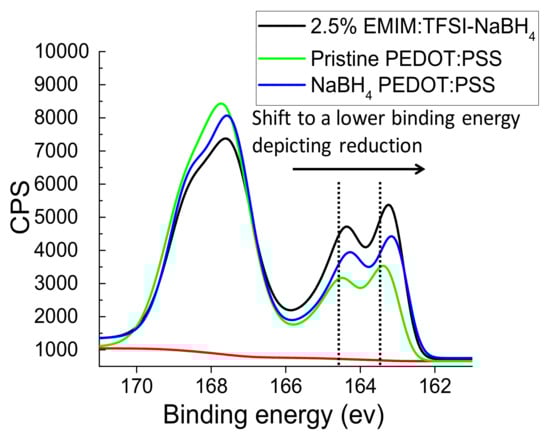 Figure 5b depicts a 2.5% EMIM:TFSI-NaBH4 treated film with peak fitting consistent with literature values [38]. Pristine PEDOT:PSS, NaBH4 and 2.5% EMIM:TFSI films can be seen in Figure S2. Due to the sulphite sulphur in PSS being bonded to highly electronegative oxygen atoms, its peak is at a higher binding energy than the thiophene sulphur in PEDOT which is bonded to the less electronegative sp2 hybridized carbons [39,40]. TFSI is bonded to carbon with electronegative fluorides attached which leads to the sulfonyl sulphur being at a higher still binding energy, as seen in Figure S2.