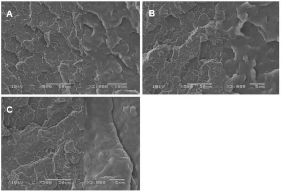 Scanning electron microscopy (SEM) micrographs of fractured surface of neat PLA (A) and PLA/TEC systems prepared by the modification in the solid (B) and molten (C) state.