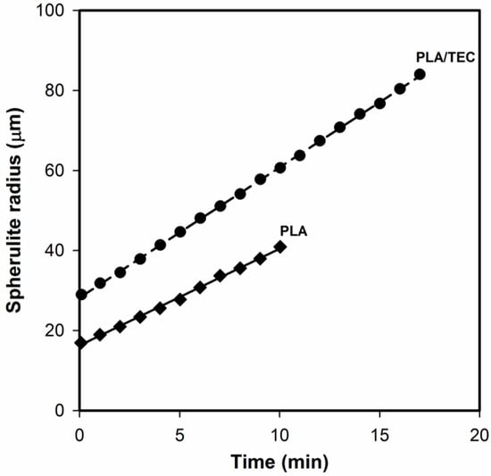 It can be seen that the surface of both PLA and PLA/TEC systems is fairly smooth without noticeable heterogeneities, which suggests that the fraction of triethyl citrate is molecularly dispersed in the polylactide matrix. The spherulite growth rate measurements confirmed the homogeneous dispersion of the plasticizer in samples of PLA/TEC. Based on the changes in spherulite radius as functions of time (Figure 2), it is clearly seen that the radius increases linearly with time also for the sample containing the triethyl citrate. This excludes, therefore, the possibility of the plasticizer accumulating in front of growing spherulite, which in consequence would lead to its segregation during crystallization.