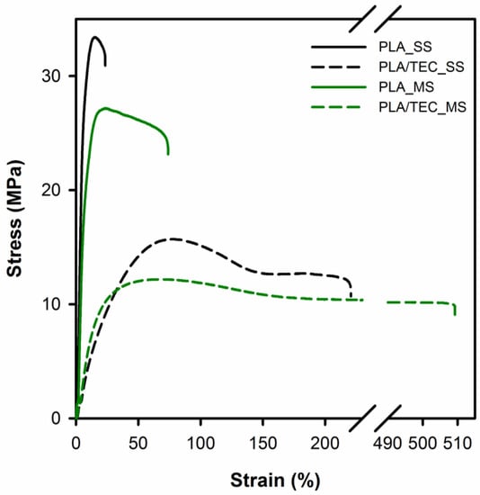 From the tensile stress vs. strain curves (Figure 3) it is noticeable that conditions of the solid state modification (heat treatment at 70 °C) influence the mechanical properties of PLA films. As shown in Table 2 the value of yield stress increases from 27.8 MPa for PLA_MS to 33.4 MPa for the PLA_SS sample, and the value of strain at fracture decreases from 75.2% for PLA_MS to 23.2% for PLA_SS. An analogous correlation in mechanical properties can be observed for PLA/TEC systems and this is probably due to the difference in the degree of crystallinity/crystal thickness of the PLA matrix itself (see DSC data, Table 3). A slightly higher crystallinity for the samples prepared by the method of solid state modification results from the phenomenon of further crystallization (annealing) of samples under the conditions of the modification process (T = 70 °C, t = 34 days).