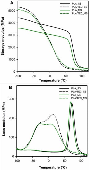 Temperature dependencies of storage modulus (A) and loss modulus (B) of PLA and PLA/TEC systems.