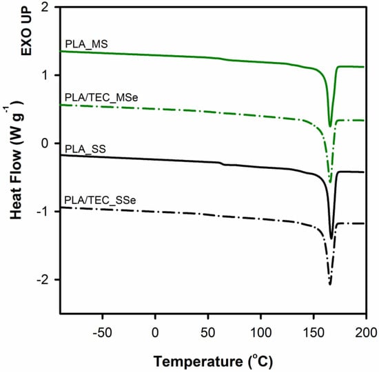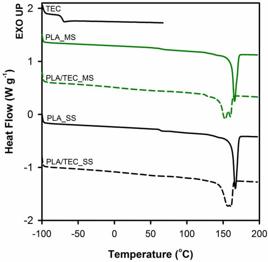 DSC thermograms of neat PLA (PLA_MS and PLA_SS) and PLA/TEC systems after plasticizer removal (PLA/TEC_MSe and PLA/TEC_SSe). Thermograms have been shifted along the vertical axis for better visualization.