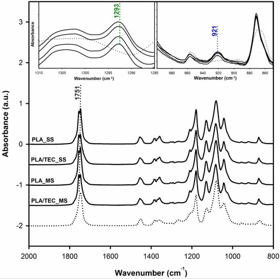 The peaks at about 1756 and 1747 cm−1 correspond to the crystalline phase and a peak at about 1740 cm−1 to the amorphous phase of PLA. As shown in Figure 7, the band at 1743 cm−1 v(C=O) of PLA/TEC systems samples compared to the peak of neat PLA (band at 1740 cm−1) are shifted to higher wavenumbers, while the position of the bands at 1756 and 1747 cm−1 does not change. This observation is associated with the interactions between PLA matrix and triethyl citrate dispersed only in its amorphous phase.