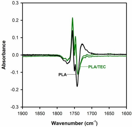 The difference spectra of PLA and PLA/TEC samples obtained from the FTIR spectra shown in Figure 6 by subtracting the amorphous PLA spectrum.