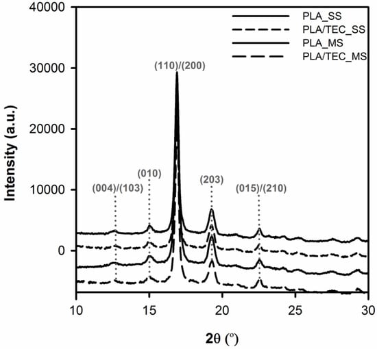 The diffraction patterns of neat (PLA_SS, PLA_MS) and plasticized PLA (PLA/TEC_SS, PLA/TEC_MS) samples.