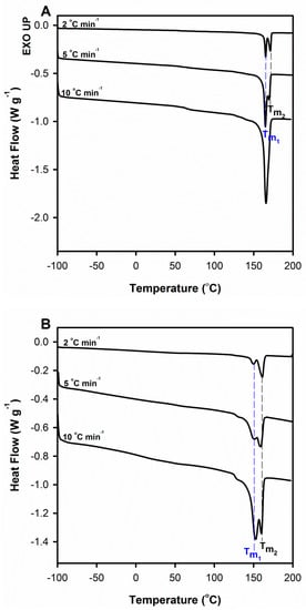 It can be observed that in the case of plasticized samples double melting peaks appear at all heating rates (Figure 10A), whereas for pure samples only for lower scan rates, i.e., 2 and 5 °C min−1 (Figure 10B). At the same time, this additional peak is clearly located at higher temperatures, which means that the analyzed phenomenon is not kinetically induced. Moreover, with the decrease in the scan rates the melting peak at higher temperature (Tm2) grew at the expense of the melting peak at lower temperature (Tm1) while the total endothermic area remained unchanged. The above phenomena are associated with the process of improvement of crystal perfection/thickness that was possible under the conditions of low heating rates. Plasticization of polymers improves the chain mobility, and therefore the rearrangement of polymer molecules upon heating to crystals with a higher degree of perfection for PLA/TEC samples will require less time than for neat PLA.