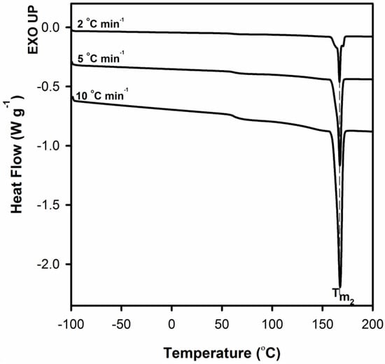 DSC melting thermograms of neat PLA after annealing at 155 °C for 10 min at different scan rates. Thermograms have been shifted along the vertical axis for better visualization.