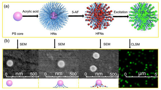 Typically, for the traditional coupling methods (TCM), 10 mg of hairy nanospheres (HNs) were added into 10 mL buffer (MES, Ph = 5.5), then 80 mg NHS and 120 mg EDC were dispersed into the buffer. The mixture was incubated for 15 min under shaking at room temperature. 5-AF, ranging from 0.5 wt.% to 4 wt.%, was dispersed into 10 mL PBS buffer (pH = 7.2), then HNs after activation of carboxyl were quickly added into the solution containing 5-AF under sonication. The solution was allowed to react for 10 h under gentle shaking at room temperature. The HFNs were purified by dialysis using pure water until the conductivity was no longer changed.