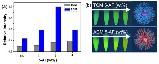 The concentration of the 5-AF was firstly set to 0.5 wt.%, which is a typical dye content in fluorescent nanospheres obtained by other methods [47,48], as shown in Figure 2a. The 5-AF content was then increased up to 4 wt.% to make full use of the abundant carboxyl groups. The fluorescence intensity of the hairy fluorescent nanospheres (HFNs) obtained by the TCM method increases slightly as the 5-AF dosage increases. Thus, the 5-AF could not contribute to the fluorescence intensity even the original dosage is at a high level. It is difficult for the TCM method, in which NHS/EDC was used as the coupling agent, to take full advantage of the ultrahigh functional groups on the HN surface.
