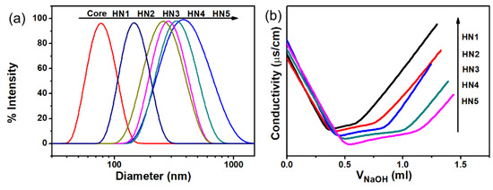 Fluorescein is connected to the carboxyl in the HNs. Therefore, the fluorescein immobilization amount is closely related to the carboxyl content, so the effect of carboxyl content on fluorescence intensity was explored in the further study. HNs with different PAA thickness were used and their characteristic parameters are shown in Table 3. the polystyrene core was 77 nm with a narrow PDI of 0.052 (the DLS profile is shown in Figure 3a) and the PAA thickness ranged from 34 nm to 139 nm. The conductivity change of the HNs was then measured by conductometric titration. The titration curve is shown in Figure 3b.