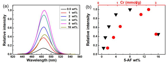 (a) The relative fluorescence intensity of HFNs with different contents of 5-AF in aqueous solution; (b) the relationship between the 5-AF dosage, reacted carboxyl content (Cr) and the fluorescence intensity of HFNs. (The core of HNs used here is 77 nm and the thickness of PAA chain is 139 nm). The synchronous fluorescence spectrum spectra were recorded at 25 °C.