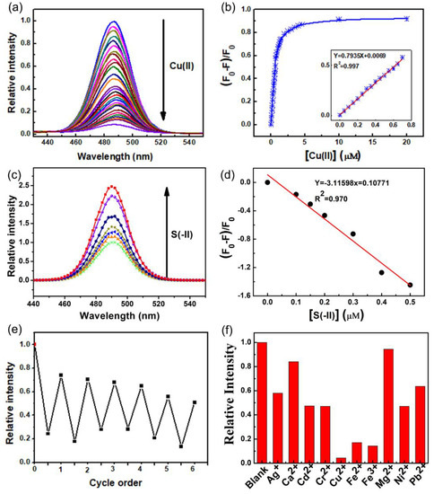In this work, HFNs (HN5 with 8 wt.% 5-AF) were selected as a detector to detect Cu(II). The fluorescence intensity of HFNs versus the concentration of Cu(II) (original fluorescence spectra is shown in Figure 6a). As we continued to increase the concentration of copper ions, the fluorescence intensity of HFNs decreased gradually. As shown in Figure 6b, the quenching efficiency (F0 − F)/F0 was found to be linear with respect to the concentration of Cu (II) (0–0.5 μM, R2 = 0.997). Therefore, HFNs can be used as a sensitive fluorescence detector for detecting the concentration of Cu(II). There is a good linear relationship between the fluorescence enhancement of Cu(II) loaded HFNs (HFNs@Cu(II)) and the concentration of S(-II) (0–0.5μM, R2 = 0.970). The recovery of HFNs from HFNs@Cu(II) could be realized by further adding sulfide anion S(-II) [50] into the HFNs@Cu(II) system. (Figure 6c,d). Apart from the sensitivity, it is also necessary to analysis the probability of reusability of the fluorescence detector [49] at a cost-effective point of view. Six sequential recovery/quenching cycles were successfully performed to remove Cu(II) from the HFNs by using S(-II) (Figure 6e). The results showed that the HFN still remained 60% of the original fluorescence intensity after six cycles.