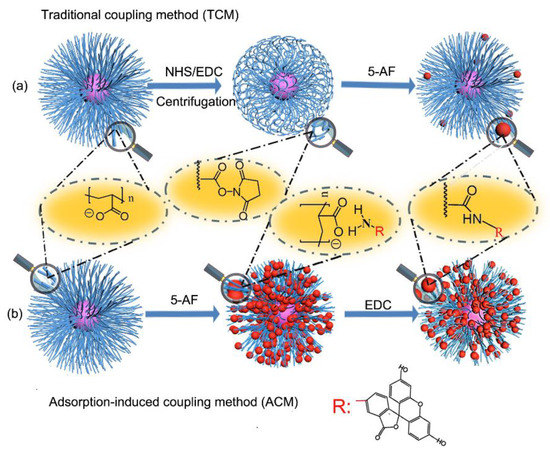 However, in the adsorption-induced coupling method (ACM), both the HNs and the 5-AF were dispersed in the MES buffer; therefore, it was easier for 5-AF to enter the inside of the HNs and carry on electrostatic adsorption owing to the unique electrostatic adsorption of the polyelectrolyte brushes [41,42,43]. The HNs with plentiful carboxyl groups were considered specifically advisable for this method, as the steric hindrance was no longer dominant in this process. Physical adsorption [44,45,46] could enable the 5-AF to enter the inside of the hairy nanospheres easily, and their positions in the polyelectrolyte could be rearranged. Therefore, a large amount of 5-AF could be embedded in the PAA structure by the electrostatic driving force. Once the EDC was added in the next step, the carboxyl groups at these unfavourable sites were activated immediately to form a strong amide bond due to high activity of EDC in the buffer at pH = 5.5.