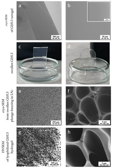 Appearance of the G0/0.3 sample at different stages: (a,b) G0/0.3 xerogel observed in the dry state as obtained by bulk polymerization; (c,d) photographs of the equilibrium water- and DMSO-swollen G0/0.3 hydrogel, respectively, (e,f) cryo-SEM from the water-swollen sample and (g,h) high vacuum scanning electron microscopies (HVSEM) of the lyophilized sample.